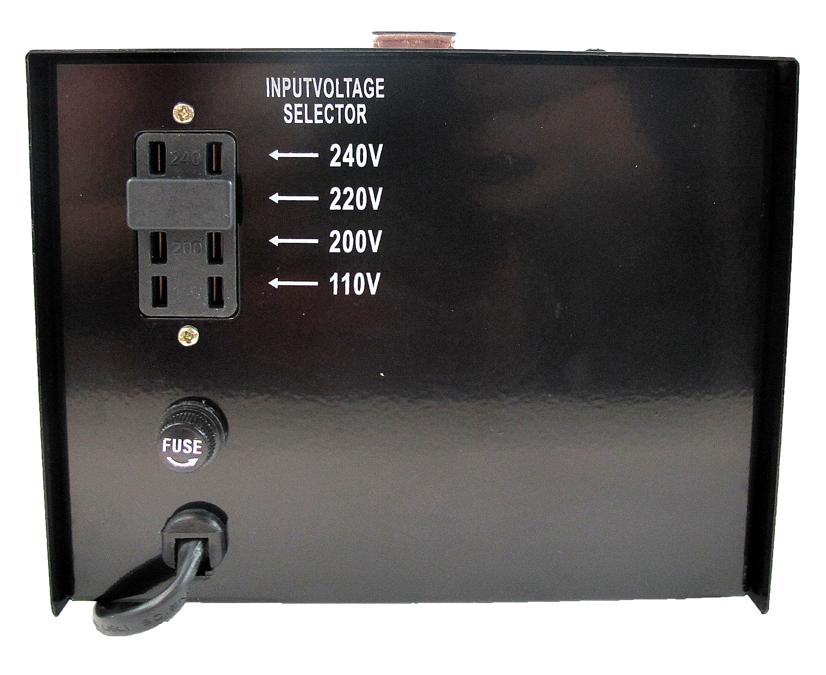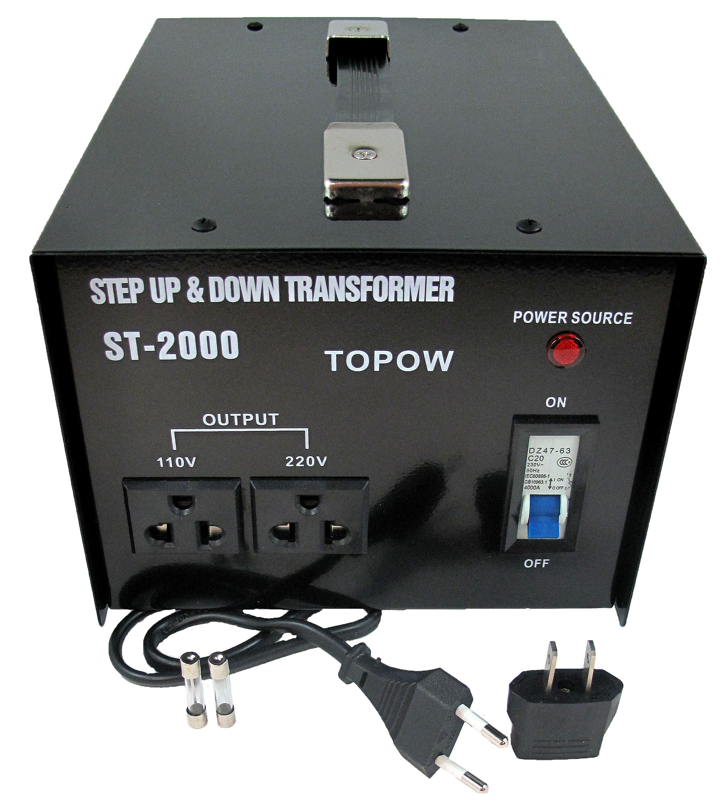 The ST-2000 is rated at 2000 watts maximum. It features a heavy duty cord with a standard round prong plug plus a free American Flat outlet plug adapter. There are a total of two outputs on the front panel. Two are grounded outputs, one designated for 110 volts with a US standard outlet, the other for 220 volts only with a universal outlet. Also uses a protective standard fuse for extra safety.